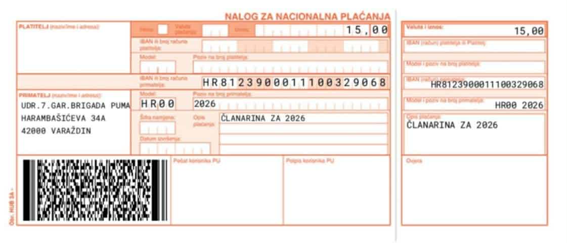 Poštovani članovi, obavještavamo Vas da članarinu za 2026. godinu možete uplatiti osobno u Udruzi veterana 7. gardijska brigada „PUMA“ , Varaždin, Harambašićeva 34 te putem internet bankarstva ili općom uplatnicom u banci ili pošti.