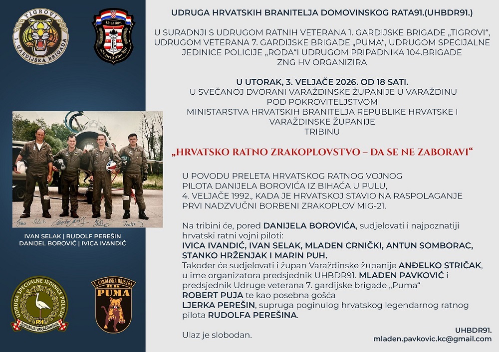 Tribina će se održati u utorak 3. veljače 2026. godine s početku u 18:00 sati u Svečanoj dvorani Varaždinske županije u Varaždinu pod pokroviteljstvom Ministarstva hrvatskih branitelja Republike Hrvatske i Varaždinske županije.