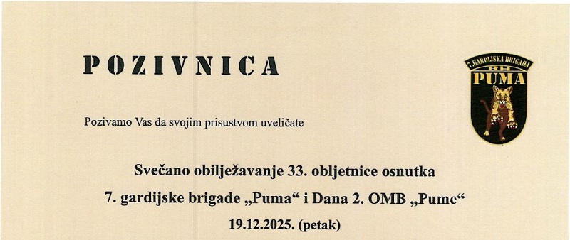 POZIV NA SVEČANO OBILJEŽAVANJE 33. OBLJETNICE OSNUTKA 7. GARDIJSKE BRIGADE „PUMA“ I DANA 2. OMB „PUME“