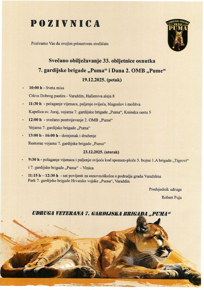 Pozivamo članove obitelji poginulih, nestalog i preminulih pripadnika 7. gardijske brigade „Puma“, bivše pripadnike 7. gardijske brigade „Puma“, članove udruge te njihove obitelji da nazoče obilježavanju 33. obljetnice osnutka 7. gardijske brigade „Puma“ i Dana 2. OMB „Pume“.